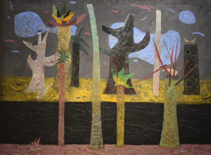 While most of the landscape paintings in the Brown collection reflect 19th-century European influences, a few notable examples bring it squarely into 20th century Modernism. Arnold Blanch’s Florida River, ca. 1955 Hilton Leeche’s Preview, ca. 1940 and several rural Florida scenes by Jules Andre Smith show elements of Abstraction. These were the dominant artistic movements during the period of the two World Wars and immediately after. Gradually the movement from Impressionism onward was a dissolution of form trending ever more abstract. Arnold Blanch’s Florida River, ca. 1955 is a prime example of compositional elements in a painting reduced to basic geometric shapes.