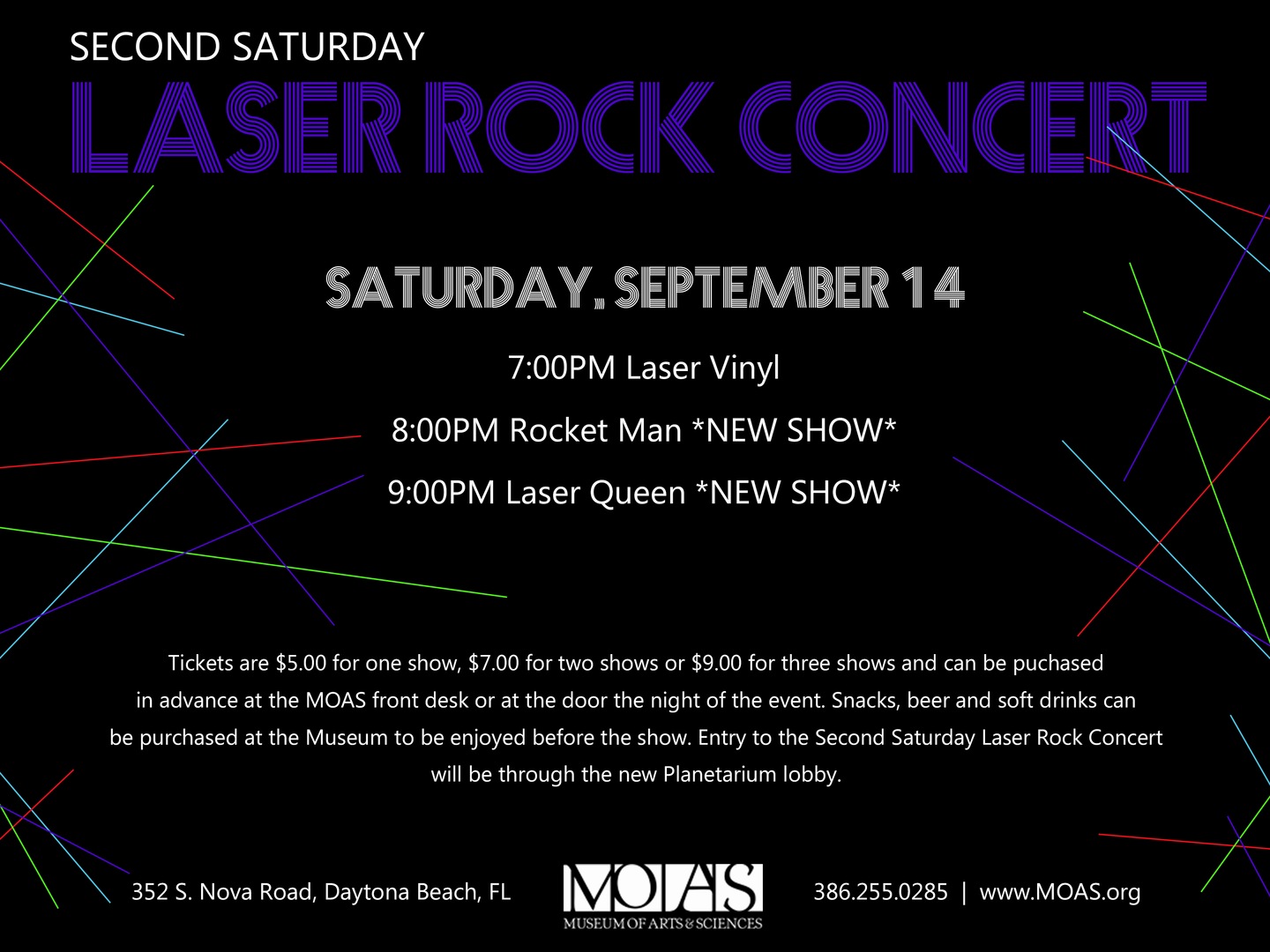 Join us monthly for a Second Saturday Laser Rock Concert in the MOAS Planetarium! Second Saturday Laser Rock Concert tickets can be purchased the week of the show at the Museum's guest relations desk or at the door the night of the event. Entry to the show is through the Planetarium lobby entrance. Seating for these concerts are limited. Snacks, beer, and soft drinks can be purchased at the Museum to be enjoyed during the show.