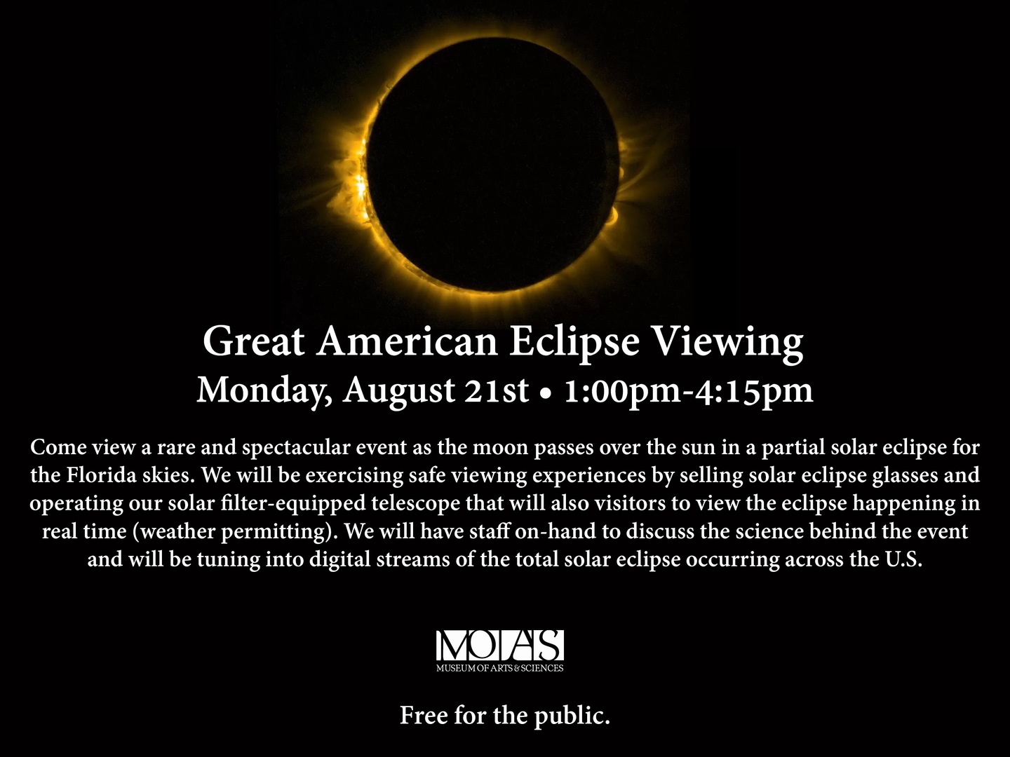 Come view a rare and spectacular event as the moon passes over the sun in a partial solar eclipse for the Florida skies. We will be exercising safe viewing experiences by operating our solar filter-equipped telescope that will allow visitors to see the eclipse happening in real time (weather permitting). We will have staff on-hand to discuss the science behind the event and will be tuning into digital streams ofthe total solar eclipse occurring across the U.S.