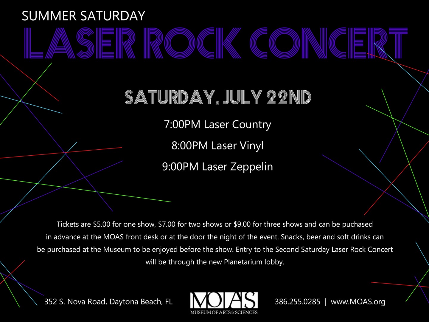 Join us monthly for a Second Saturday Laser Rock Concert in the MOAS Planetarium! Second Saturday Laser Rock Concert tickets can be purchased the week of the show at the Museum's guest services desk or at the door the night of the event. Entry to the show is through the Planetarium lobby entrance. Seating for these concerts are limited. Snacks, beer, and soft drinks can be purchased at the Museum to be enjoyed during the show.