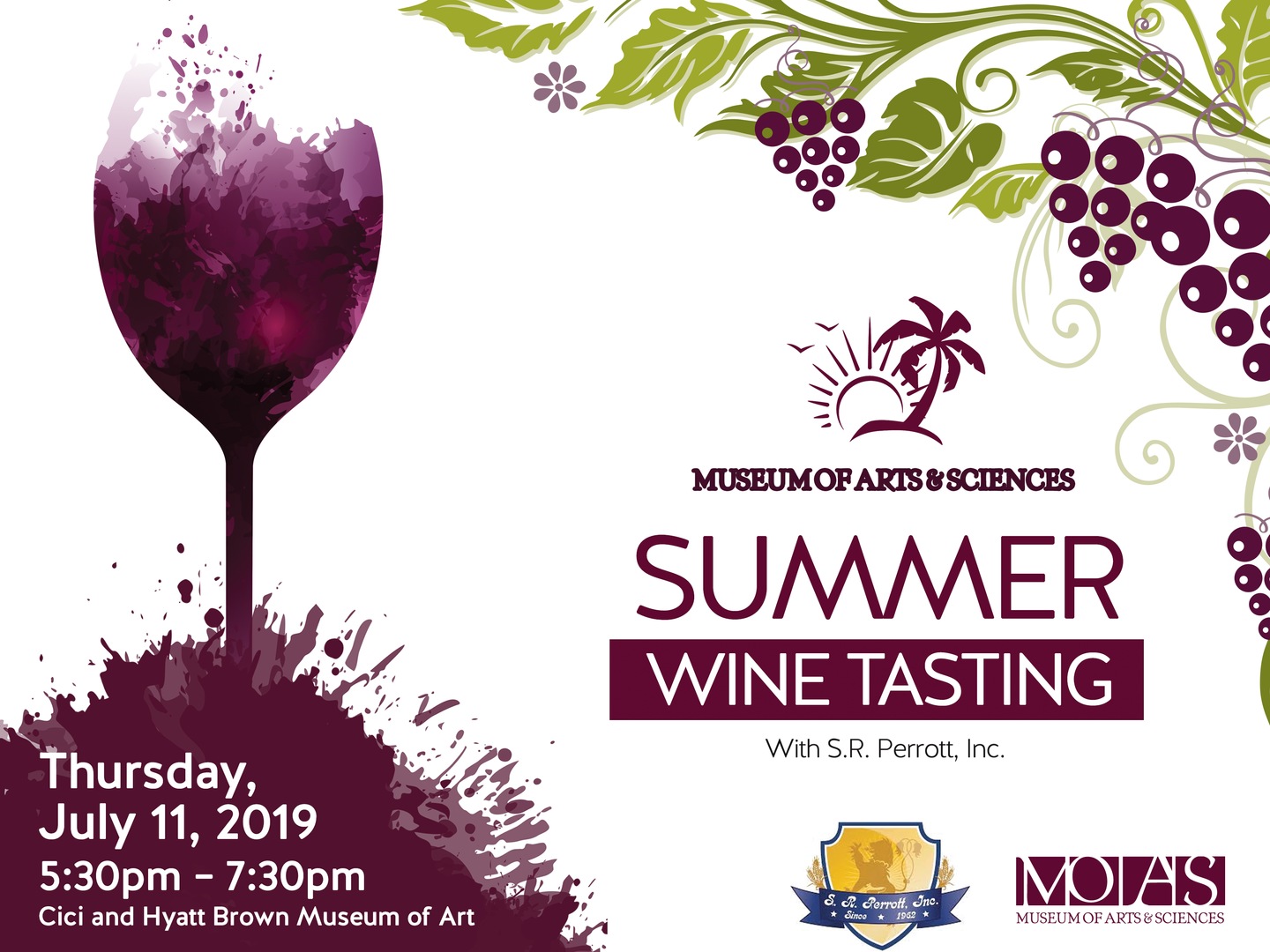 Join us at the Cici and Hyatt Brown Museum of Art for our quarterly wine tasting series with S.R. Perrott. Spend the evening among friends while you sip up knowledge by swirling, tasting, and describing wine while enjoying light appetizers from Panheads Catering.