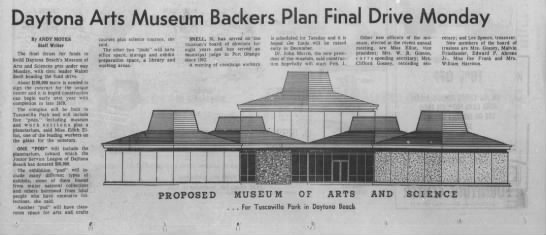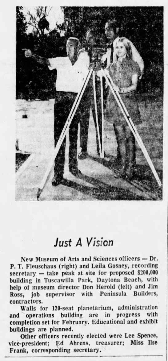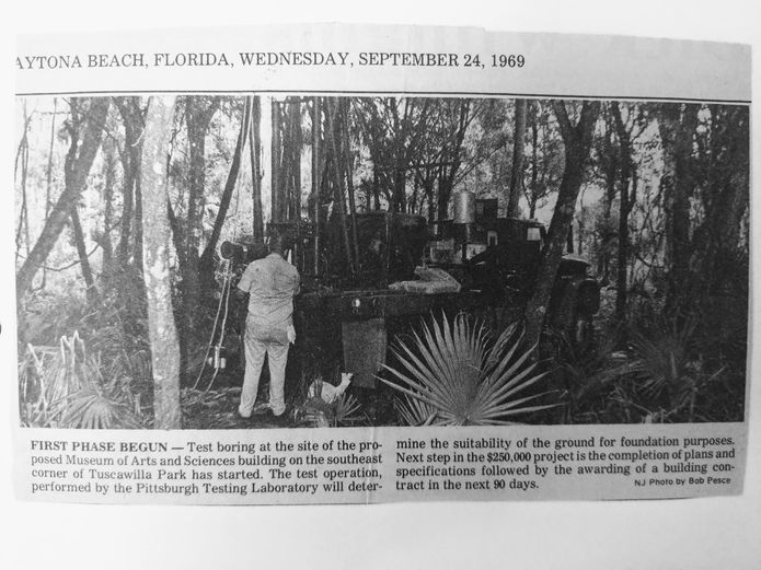 On February 9, 1961 the Halifax Children’s Museum announced its decision to change its name to the Museum of Arts and Sciences. With this came a change in programing with adult science classes and lecture series being offered in addition to the existing children’s programs. By May of the same year enough support for the museum’s move to Tuscawilla had been gained to form a Building Committee to begin to plan for the new facility. By the spring of 1962 the museum submitted building plans to the City Commission. The building plans included a planetarium, classrooms, a library, and a lecture hall. In December of that year the Museum of Arts and Sciences received its official charter from the State of Florida.