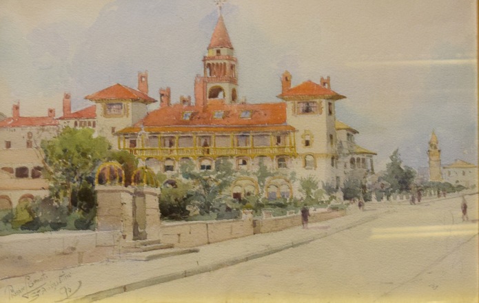 On display in the Cici and Hyatt Brown Museum of Art witin the permanent gallery is a wonderful watercolor landscape of the Ponce de Leon Hotel, c. 1896, painted by Louis Prosper Senat (1853-1925). It is one of the earliest known watercolor paintings of the hotel. Senat was born into a wealthy family in Germantown, Pennsylvania. He studied in Paris and traveled and painted all over Europe. He typically worked in oil and watercolor and was a skilled master of both. He specialized in topographical landscapes and seascapes. Senat exhibited his work all over the United States and across the world.