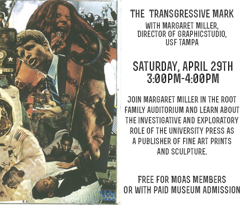 Florida has a strong connection to the mid-twentieth century printmaking traditions on view in the exhibition Pulled, Pressed and Screened: Important American Prints from Syracuse University Art Museum. In 1968, Dr. Donald J. Saff founded Graphicstudio in Tampa as part of the renaissance in American printmaking. Since that time, the studio has invited over 100 emerging and established contemporary artist from around the world who have produced more than 1,000 limited edition print and sculpture multiples. Join Margaret Miller, Director of Graphicstudio, in the Root Family Auditorium and learn about the investigative and exploratory role of the university press as a publisher of fine art prints and sculpture. Questions will be addressed such as, “What are the optimum conditions to encourage experimentation with new forms and concepts?”
