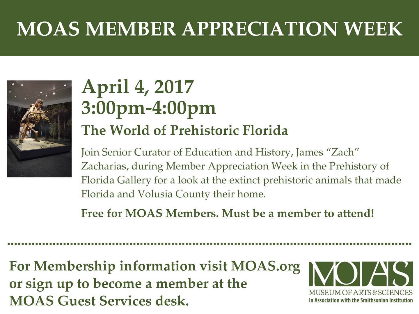 Join Senior Curator of Education and History, James “Zach” Zacharias, during Member Appreciation Week in the Prehistory of Florida Gallery for a look at the extinct prehistoric animals that made Florida and Volusia County their home. From giant ground sloths, mammoths, and saber toothed tigers, our region was teaming with beasts from the last ice age. Discover the incredible fossil record that makes Florida one of the most fossil rich areas in the world.