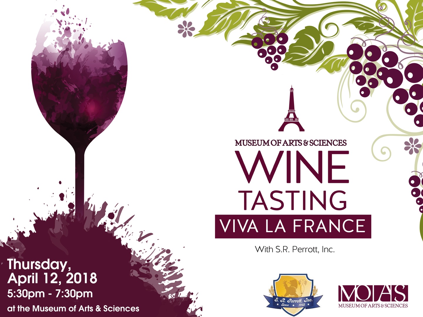Join us for our first wine tasting event to be held in the Entry Court at the Museum of Arts & Sciences with our friends at S.R. Perrott. Spend the evening with friends while you sip up knowledge on swirling, tasting, and describing wines while learning about different food pairings with light appetizers. During this month's program, we will explore different regions of France.