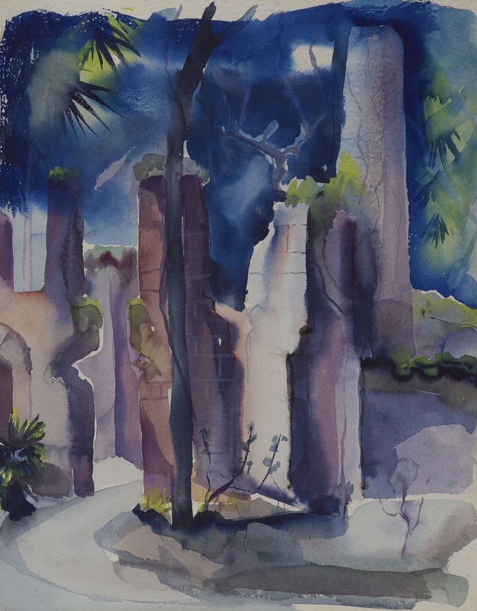 In 1946, Elsie’s husband Louis took a position as chairman of the art department at Stetson University in Deland, Florida. Sometime in 1960, Elsie visited the mystical looking ruins of Bulow Plantation on the Volusia/Flagler County border. In this watercolor titled, “Bulow Ruins,” ca. 1960, she captures the towering ruins of the sugar mill against a deep and dark blue sky. She depicts a pathway that leads the visitor into the center of the ruins giving the viewer a perspective of the massive coquina ruins. Back in the early 1800’s, Charles Wilhelm Bulow and his son moved from Charleston, South Carolina, to set up a sugar plantation with some 300 slaves for the production of molasses for rum. Situated on Bulow Creek, John Bulow inherited the property when his father passed away not long after acquiring the land. In December 1831, the famed naturalist and bird artist, John James Audubon, was a guest at Bulowville plantation. The ruins depicted by Elsie are not created by the ravages of time but by the destruction of the Seminole Indians. In January 1836, at the beginning stages of the Second Seminole War, a Seminole war party swept into the region and burned all of the plantations along the Halifax River area including Bulowville.