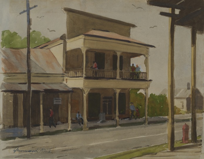 “Main Street, Cedar Key, Florida,” ca. 1950, by Marion Greenwood, depicts a street scene of Cedar Key, one of the most unique historic towns in Florida. Marion Greenwood was born in Brooklyn, New York, on April 6, 1909, and died in Woodstock on August 20, 1970. She was an American social realist artist who became popular starting in the 1920s. Marion was the first American woman to receive a painting commission for a mural painting by a foreign government. She painted a fresco depicting Tarascan Indian life at a university in Mexico. Marion became renowned in both the United States and Mexico and is well known for her powerful murals. She worked as a WPA artist and later was appointed as an artist war correspondent in World War II. Marion also practiced easel painting, printmaking, and frescoes showing gritty scenes of working classes or insightful portraits. In 1950, she traveled to Cedar Key, Florida, and captured the unique architecture of the many historic buildings that line Main Street of this once traditional old style-fishing village. Marion also includes local residents going about their daily lives on this poor, rural, and remote island on the West Coast of Florida in Levy, County. This coastal fishing village has a colorful history, never averaging more than 700 residents in the American census. Even today, a visitor to Cedar Key will immediately notice the feel of a small fishing community stuck in another time.
